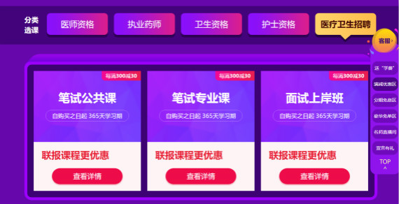 2019年6月份醫(yī)療事業(yè)單位考試課程報(bào)課滿300減30啦!奔走相告!醫(yī)學(xué)教育網(wǎng)醫(yī)療衛(wèi)生招聘欄目購課每滿300元立減30元,每滿600元立減60元...上不封頂!而且該優(yōu)惠與課程聯(lián)報(bào)優(yōu)惠可疊加使用!真是沒有最優(yōu)惠,只有更優(yōu)惠!