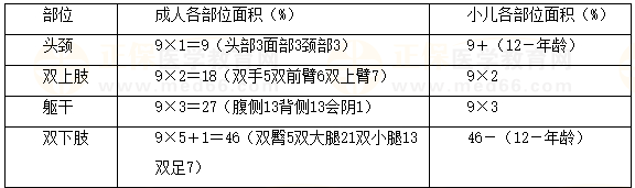 中國新九分法適用于較大面積燒傷的評估。該法將體表面積分為11個9%,另加會陰區(qū)的1%,構(gòu)成100%的體表面積。12歲以下小兒頭部面積較大,雙下肢面積相對較小,測算方法應結(jié)合年齡進行計算(見下表)。