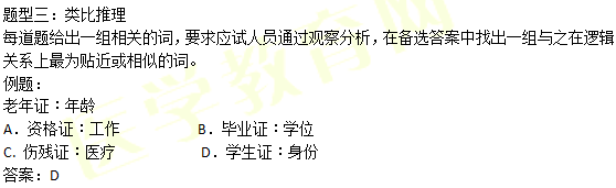 主要測(cè)查應(yīng)試人員對(duì)各種事物關(guān)系的分析推理能力,涉及對(duì)圖形、語詞概念、事物關(guān)系和文字材料的理解、比較、組合、演繹和歸納等。常見的題型有:圖形推理、定義判斷、類比推理、邏輯判斷等。