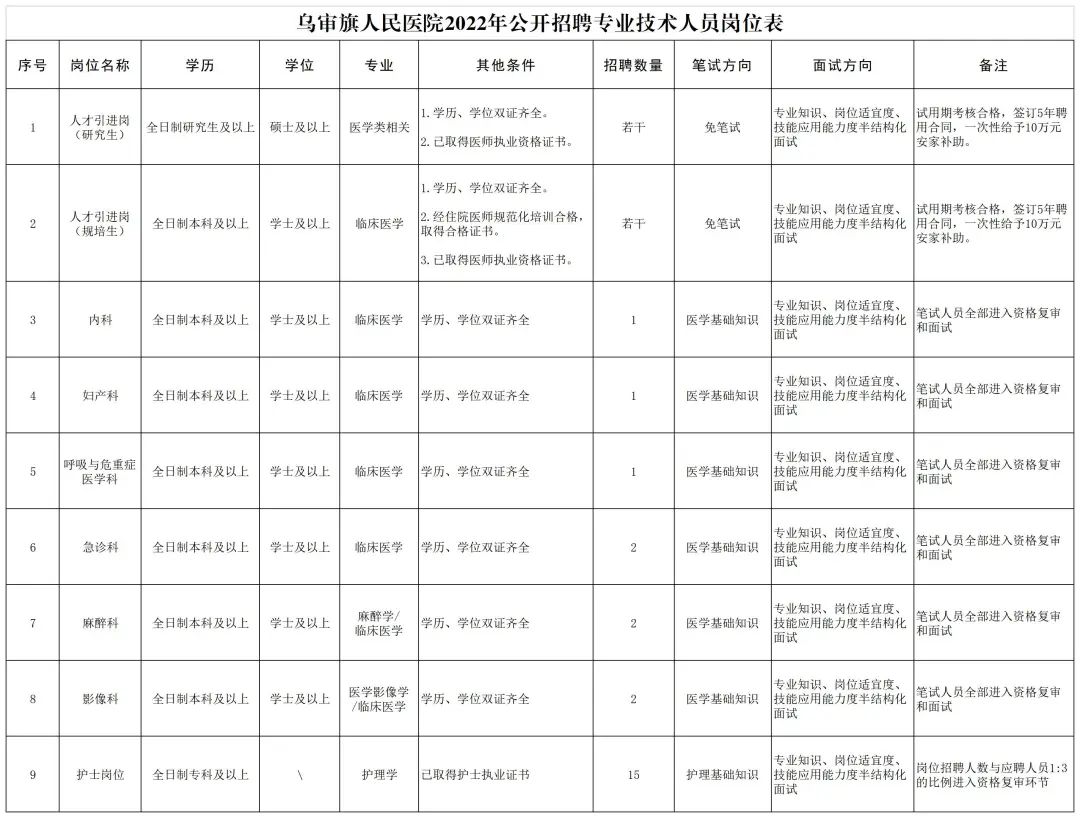 內(nèi)蒙古鄂爾多斯市烏審旗人民醫(yī)院招聘專業(yè)技術(shù)人員24人、高層次人才若干