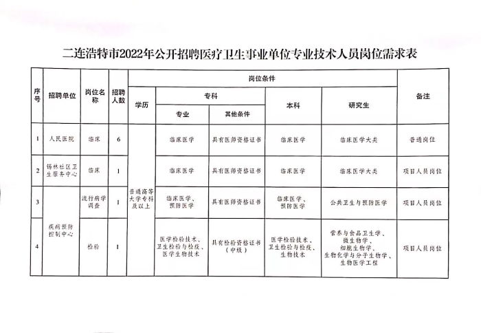8.具備應(yīng)聘崗位所要求的其他資格條件(詳見《二連浩特市2022年公開招聘醫(yī)療衛(wèi)生事業(yè)單位專業(yè)技術(shù)人員崗位表》)。