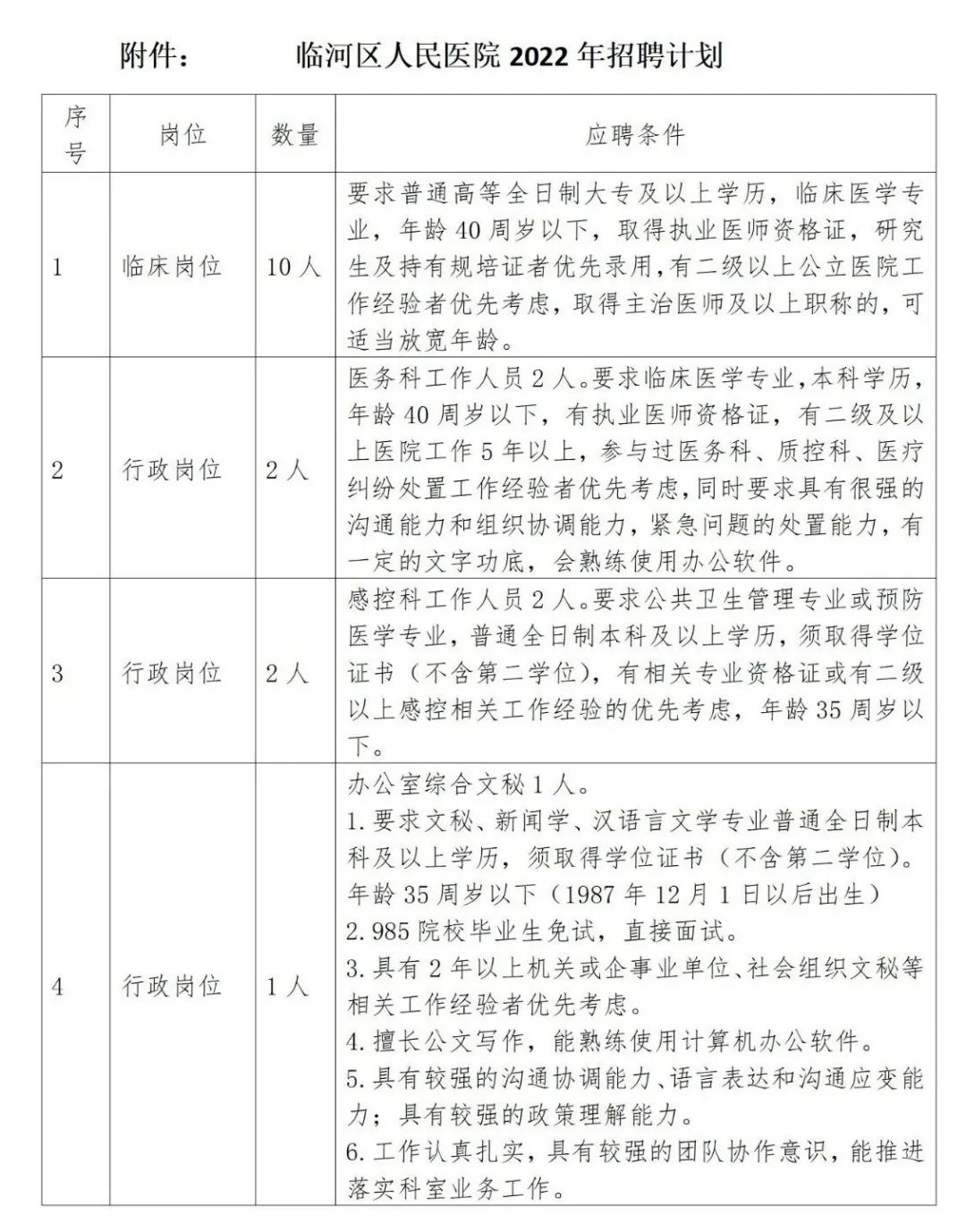 本次招聘涉及臨床、行政崗位,招聘崗位詳見(jiàn)《臨河區(qū)人民醫(yī)院2022年招聘計(jì)劃》(附件)