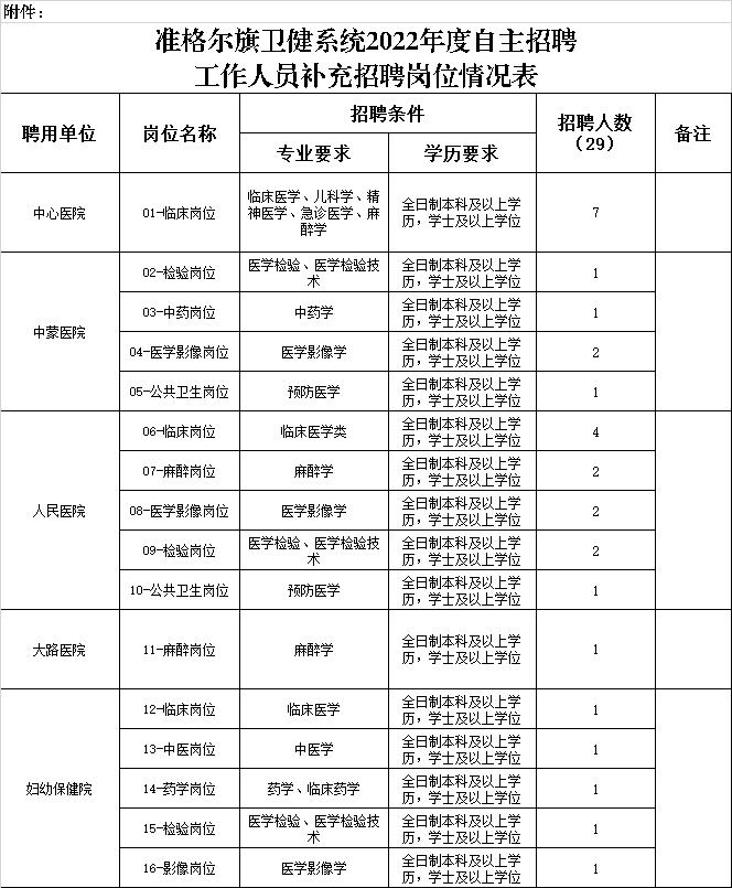 一、補(bǔ)充計(jì)劃招聘29名,其中,旗婦幼保健院招聘5名,旗中心醫(yī)院招聘7名,旗中蒙醫(yī)院招聘5名,旗人民醫(yī)院招聘11名,旗大路醫(yī)院招聘1名。具體招聘崗位、條件等詳見(jiàn)《準(zhǔn)格爾旗衛(wèi)健系統(tǒng)2022年度自主招聘工作人員補(bǔ)充招聘崗位情況表》。