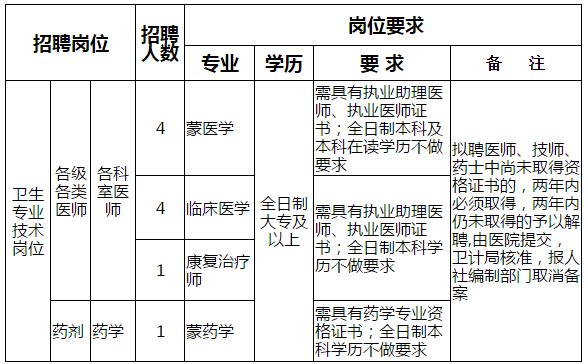 本次公開(kāi)招聘蒙中醫(yī)藥及臨床醫(yī)學(xué)衛(wèi)生專(zhuān)業(yè)技術(shù)人員10名,崗位要求見(jiàn)附件《2019年海南區(qū)公開(kāi)招聘海南區(qū)人民醫(yī)院備案制工作人員崗位表》(以下簡(jiǎn)稱(chēng)《招聘崗位表》)。