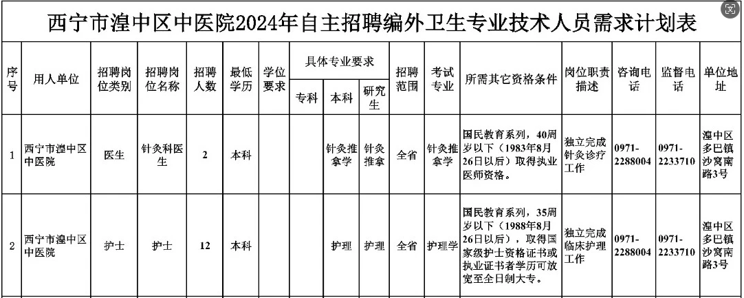 根據(jù)《西寧市湟中區(qū)中醫(yī)院2024年自主招聘編外衛(wèi)生專業(yè)技術(shù)人員計劃》,現(xiàn)面向社會公開招聘編外專業(yè)技術(shù)人員14名,具體有關(guān)事項公告如下: