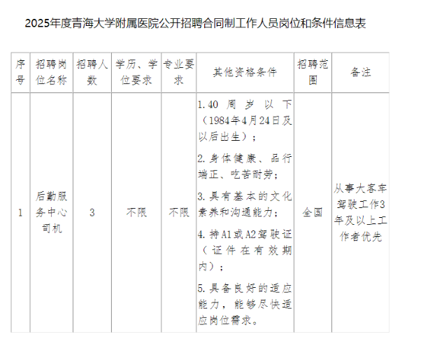 具體條件詳見《2025年度青海大學(xué)附屬醫(yī)院公開招聘合同制工作人員崗位和條件信息表》。