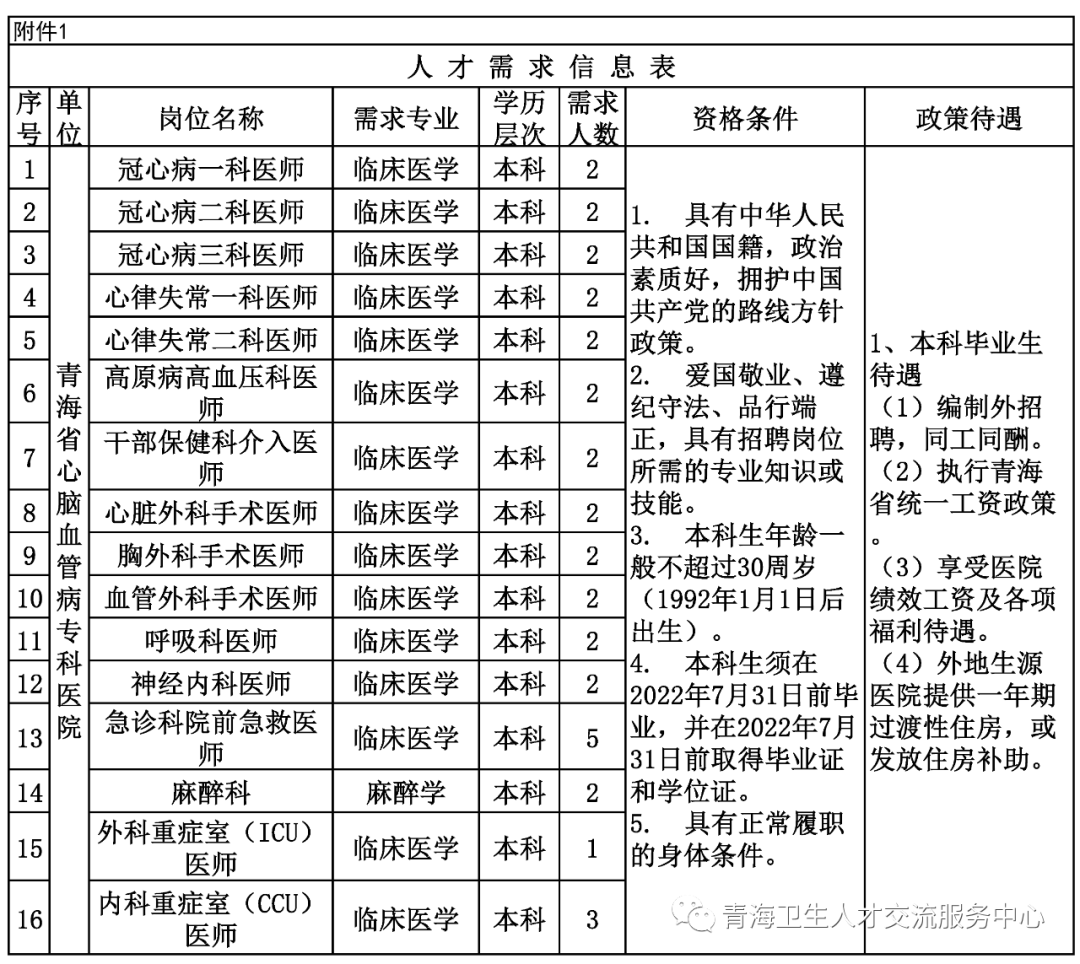 根據(jù)我院專業(yè)技術(shù)人員缺員情況和醫(yī)院發(fā)展需要,招聘相關(guān)崗位工作人員,具體崗位、人數(shù)、要求及待遇詳見附表《青海省心腦血管病??漆t(yī)院2022年校園引才計劃表》(本科崗)。