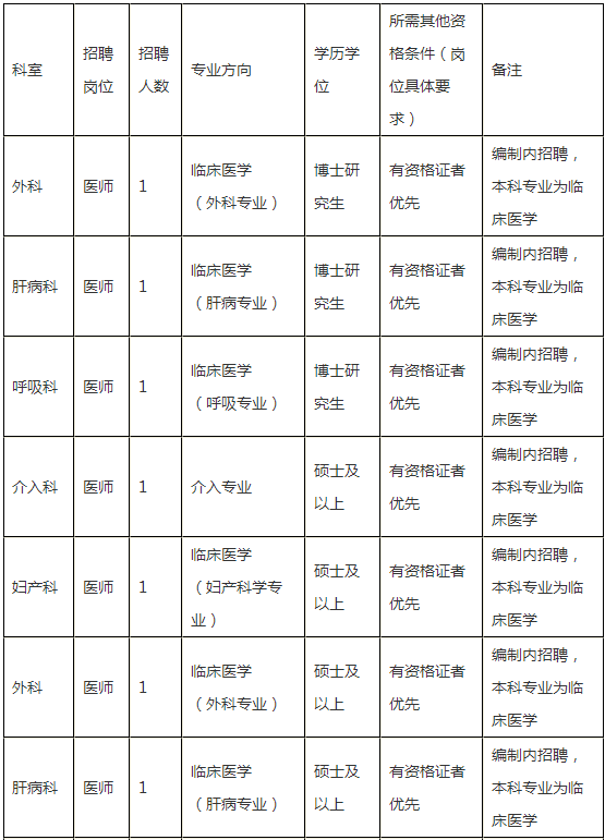 因醫(yī)院不斷發(fā)展壯大,四座大樓拔地而起,新興科室蓬勃發(fā)展,為進一步提升醫(yī)院發(fā)展能力,努力開創(chuàng)醫(yī)院事業(yè)發(fā)展的新局面,擬向社會公開招聘衛(wèi)生相關(guān)專業(yè)博士研究生3人、碩士研究生8人、緊缺專業(yè)本科生30人,現(xiàn)將有關(guān)事項公告如下: