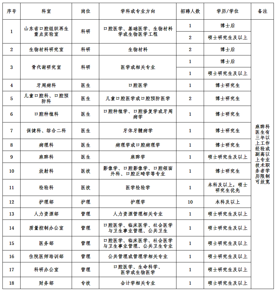 2020年山東大學(xué)口腔醫(yī)院公開招聘醫(yī)療崗崗位表