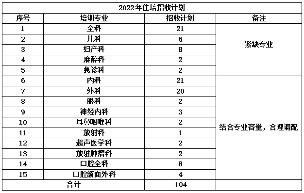 我院住院醫(yī)師規(guī)范化培訓(xùn)專業(yè)基地共15個(gè),根據(jù)山東省衛(wèi)生健康委下達(dá)的學(xué)員招收計(jì)劃及專業(yè)基地培訓(xùn)容量情況,共招收104人,具體如下: