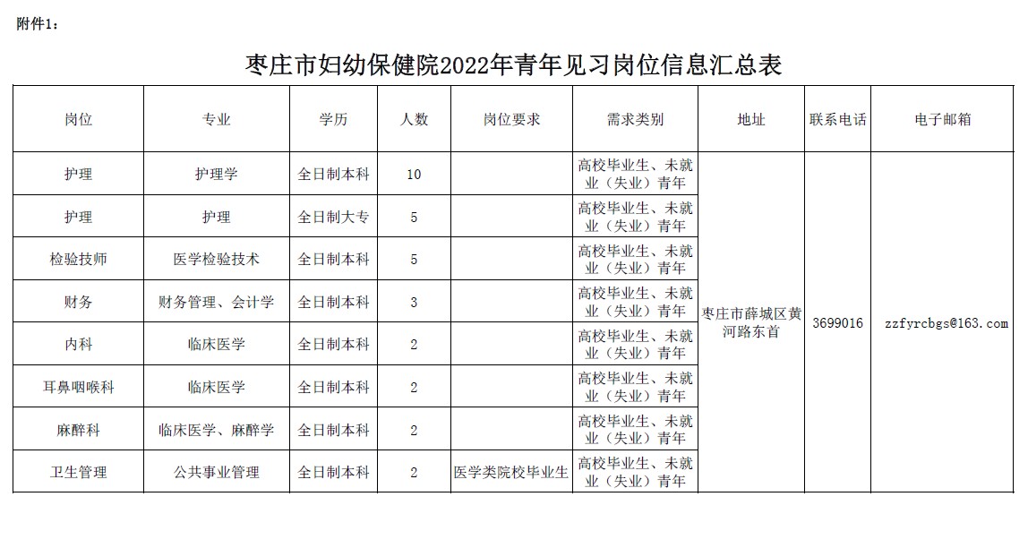 附件1:棗莊市婦幼保健院2022年青年見習(xí)崗位信息匯總表