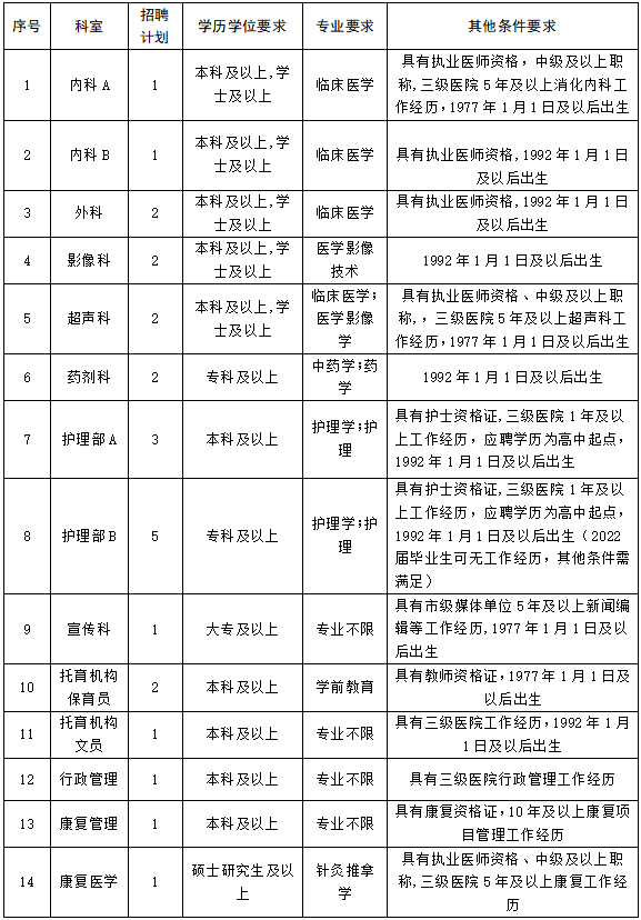 2、現(xiàn)場(chǎng)資格審核:請(qǐng)報(bào)名者于2023年2月15日(8:00-17:00)持畢業(yè)證(護(hù)理崗位含高中階段)、學(xué)位證、身份證、相關(guān)崗位證書原件及復(fù)印件、招聘人員報(bào)名表、2張一寸彩色照片到醫(yī)院學(xué)術(shù)報(bào)告廳(張店區(qū)北天津路66號(hào)9號(hào)樓1樓)進(jìn)行現(xiàn)場(chǎng)資格審核。在職人員還需提供單位同意報(bào)考證明材料或解除、終止勞動(dòng)合同證明書等說明材料。