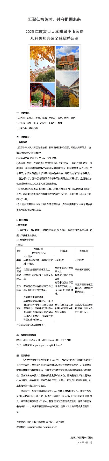 醫(yī)療招聘進(jìn)行時!各地紛紛發(fā)布醫(yī)療招聘公告,廣納賢才,醫(yī)學(xué)教育網(wǎng)為了更好的服務(wù)有就業(yè)意愿的相關(guān)醫(yī)療人員,將會為大家整理并更新各地醫(yī)療招聘的相關(guān)公告,大家可持續(xù)關(guān)注!以下是公告“2025復(fù)旦中山醫(yī)院兒科醫(yī)師崗位招聘”的相關(guān)內(nèi)容: