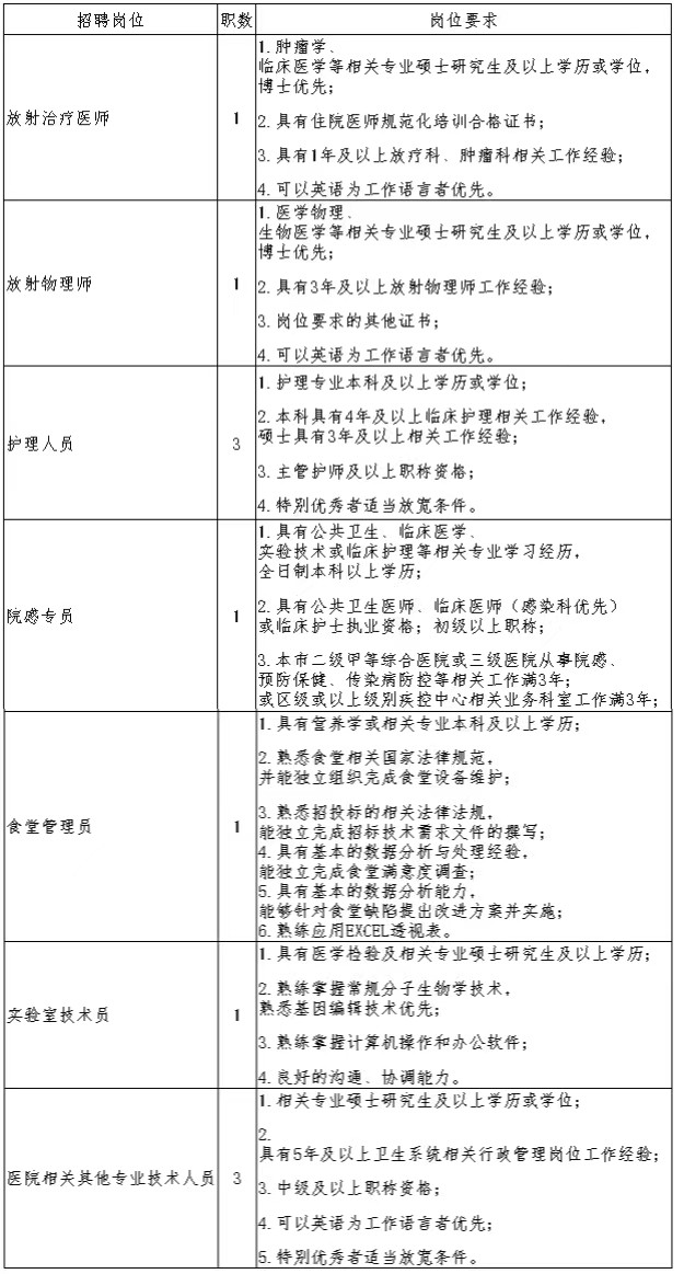 很多即將步入醫(yī)療崗位的朋友們都非常關(guān)注所在地區(qū)醫(yī)療崗位的招聘公告信息,醫(yī)學(xué)教育網(wǎng)醫(yī)療衛(wèi)生招聘欄目為了更好的服務(wù)正在找工作的醫(yī)療相關(guān)專業(yè)人員,每天為大家整理搜集新鮮的各地醫(yī)療衛(wèi)生系統(tǒng)/醫(yī)院等招聘公告通知和信息,歡迎大家查看!以下是公告通知:上海市質(zhì)子重離子臨床技術(shù)研發(fā)中心2022年招聘工作人員11名,內(nèi)容如下: