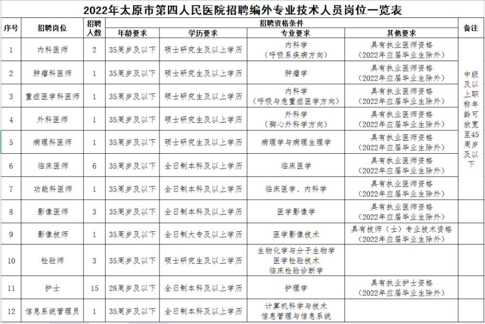 附:《2022年太原市第四人民醫(yī)院招聘編外專業(yè)技術(shù)人員崗位一覽表》