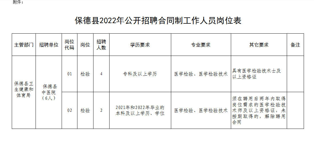 4.招聘崗位所需要的其他條件:具體資格條件等詳見《保德縣2022年公開招聘合同制工作人員崗位表》。