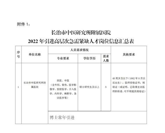 山西省長(zhǎng)治市中醫(yī)研究所附屬醫(yī)院2022年引進(jìn)高層次急需緊缺人才5名