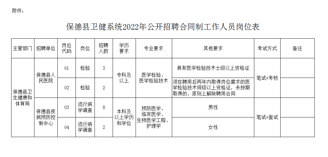 3.學(xué)歷、專業(yè)要求:具體學(xué)歷、學(xué)位及專業(yè)要求詳見《保德縣衛(wèi)健系統(tǒng)2022年公開招聘合同制工作人員崗位表》。