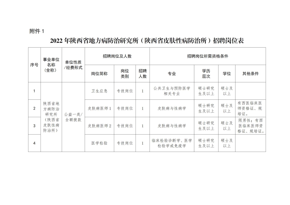 附件1:2022年陜西省地方病防治研究所(陜西省皮膚性病防治所)招聘崗位表