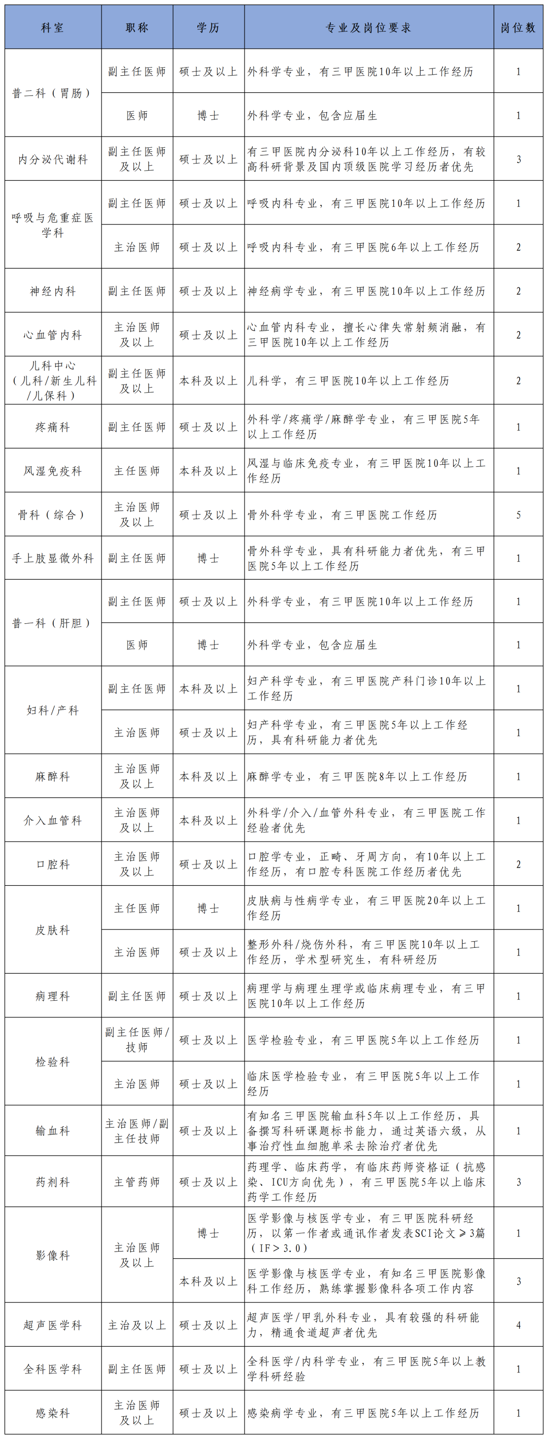 根據(jù)醫(yī)院發(fā)展需要,計劃引進一批醫(yī)學類高層次人才,具體崗位及人數(shù)如下: