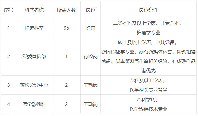 3.表格所要求崗位中博士年齡不超過(guò)35歲,其他崗位年齡不超過(guò)30歲(護(hù)崗不超過(guò)25歲,二本及以上,非專升本)。年齡計(jì)算截止時(shí)間2022年4月1日。條件優(yōu)秀者,可適當(dāng)放寬年齡限制;