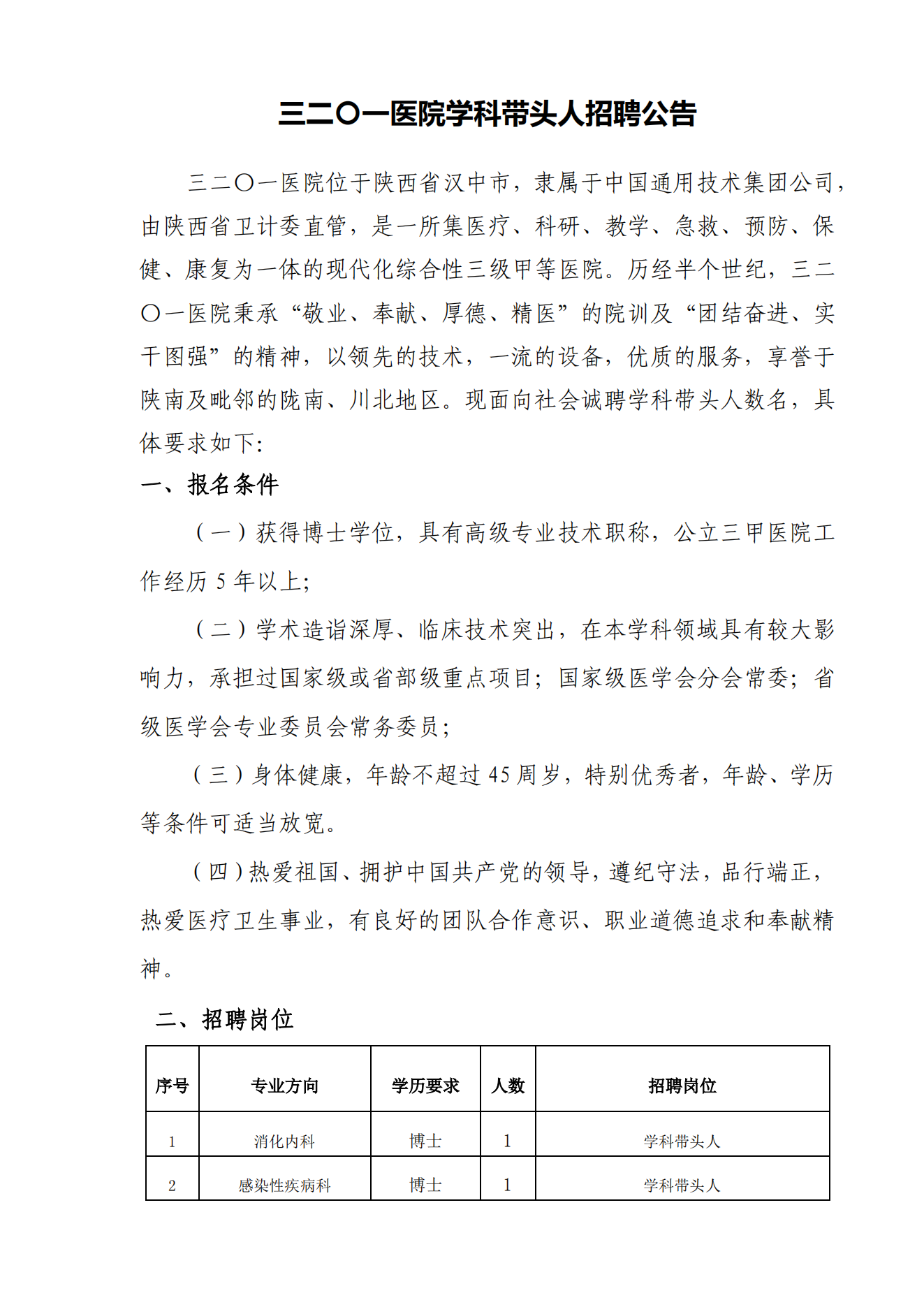 陜西省漢中市三二〇一醫(yī)院2022年招聘學(xué)科帶頭人5名