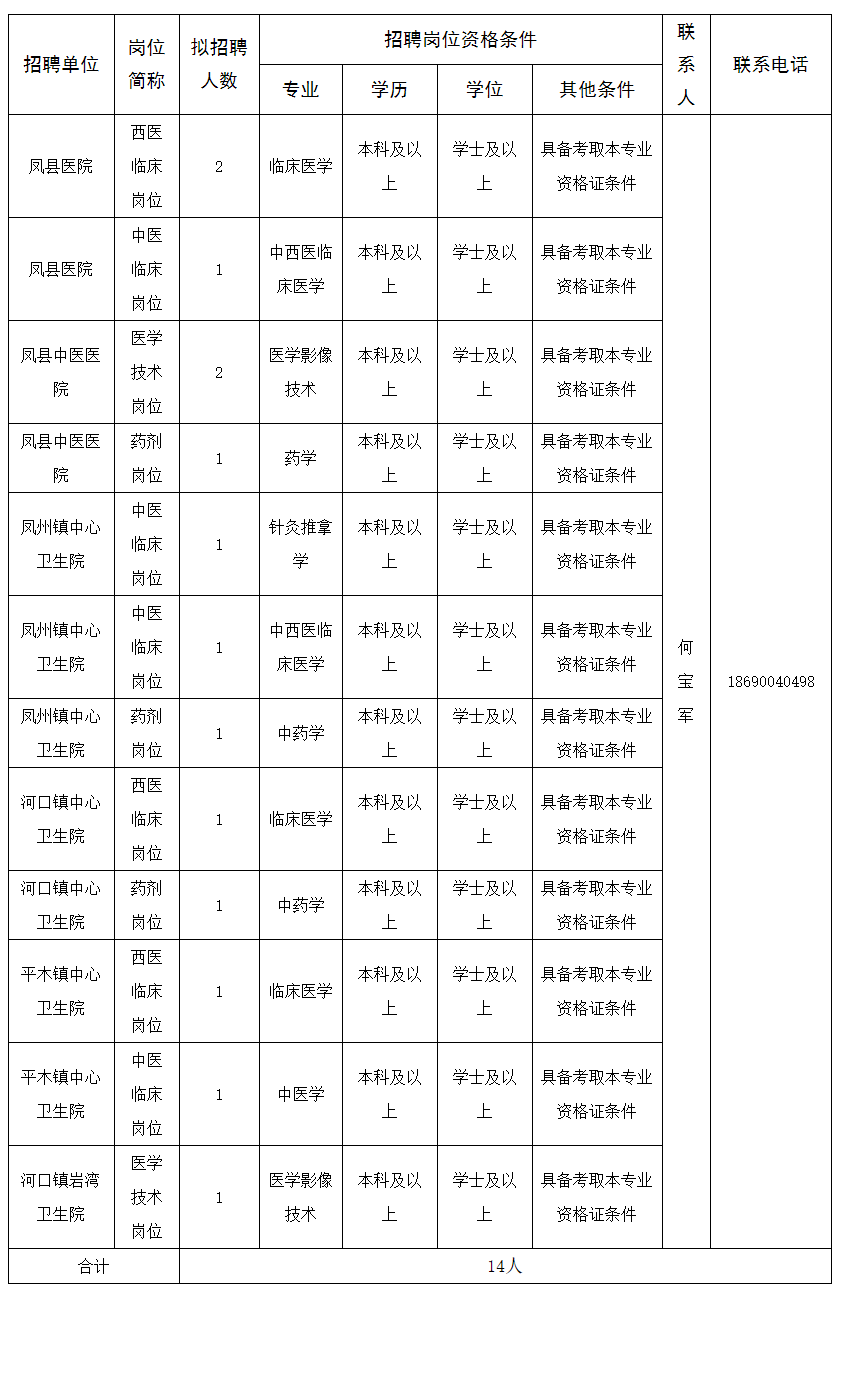 招聘名額14名,以《鳳縣2022年醫(yī)療衛(wèi)生機構(gòu)定向招聘醫(yī)學(xué)類本科生補充招聘計劃表》為準(zhǔn)。