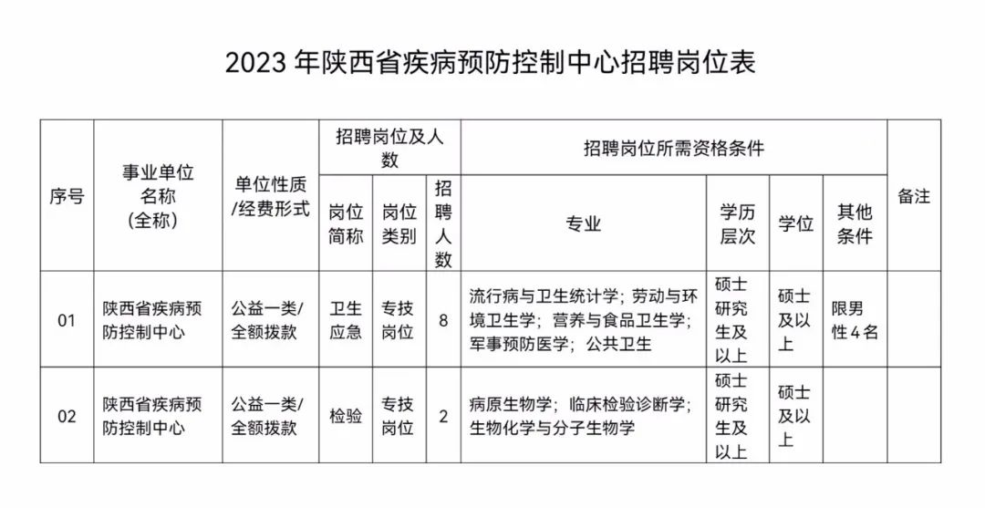 招聘崗位所需的學(xué)歷、專業(yè)條件以《2023年陜西省疾病預(yù)防控制中心招聘崗位表》為準(zhǔn)。