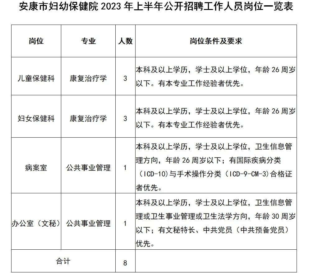 4.招聘崗位所需的具體條件以《安康市婦幼保健院2023年上半年公開招聘工作人員崗位一覽表》(附件1)的要求為準。