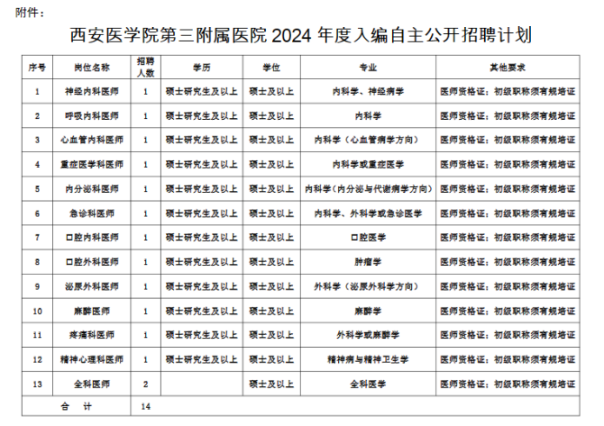附件:西安醫(yī)學(xué)院第三附屬醫(yī)院2024年度入編自主公開(kāi)招聘計(jì)劃