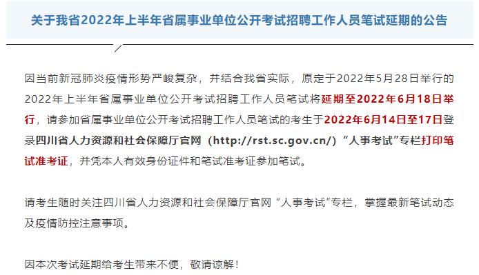 重要提醒!四川省2022年上半年省屬事業(yè)單位公開考試招聘筆試延期