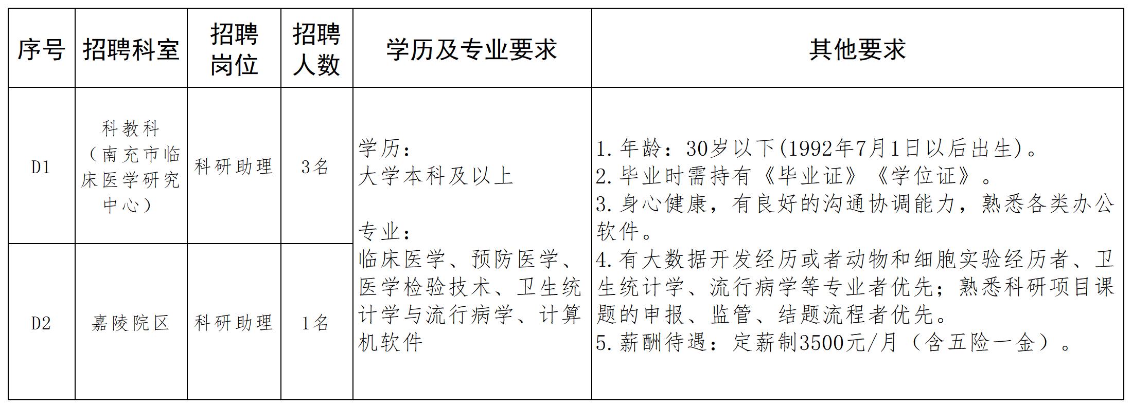 四川省南充市中心醫(yī)院2022年招聘科教科、嘉陵院區(qū)科研助理4名