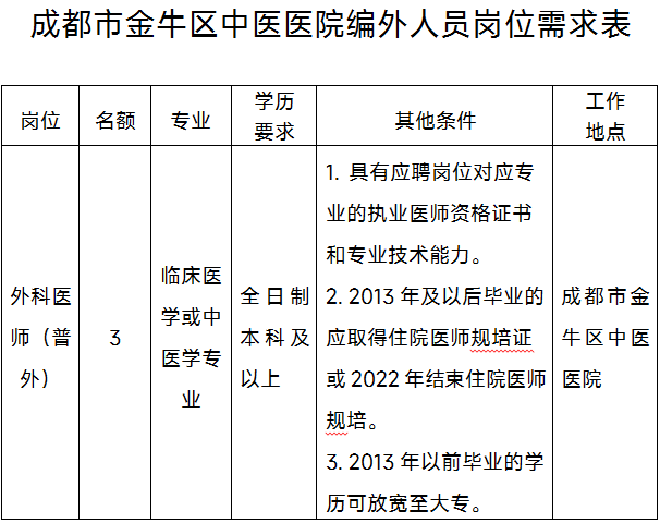 成都市金牛區(qū)中醫(yī)醫(yī)院2022年9月招聘外科醫(yī)師3名