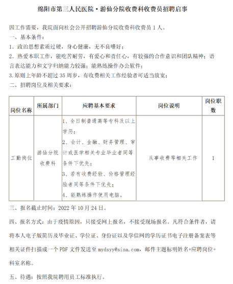 綿陽市第三人民醫(yī)院招聘游仙分院收費科收費員1人