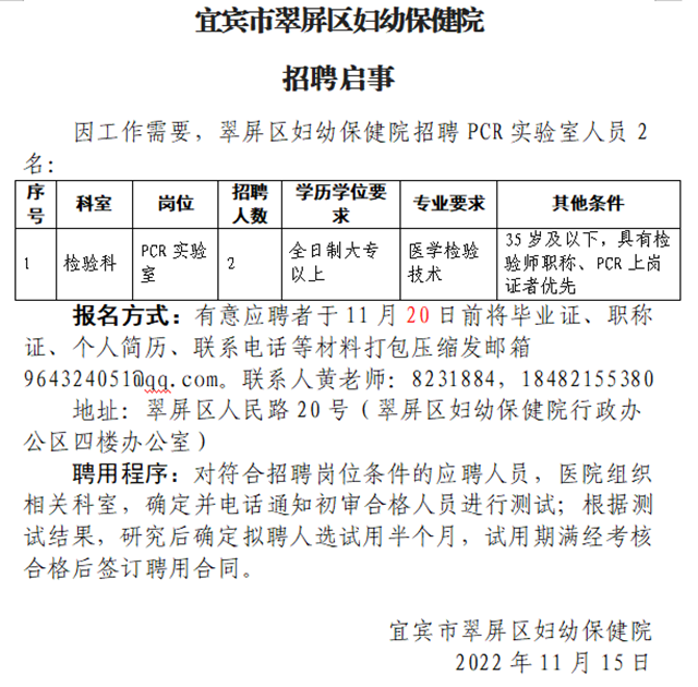 宜賓市翠屏區(qū)婦幼保健院招聘檢驗(yàn)科工作人員2人