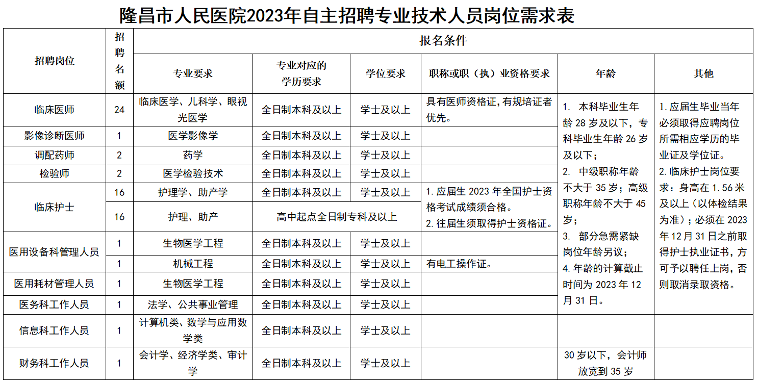 詳見(jiàn)附件《隆昌市人民醫(yī)院2023年自主招聘專業(yè)技術(shù)人員崗位需求表》。