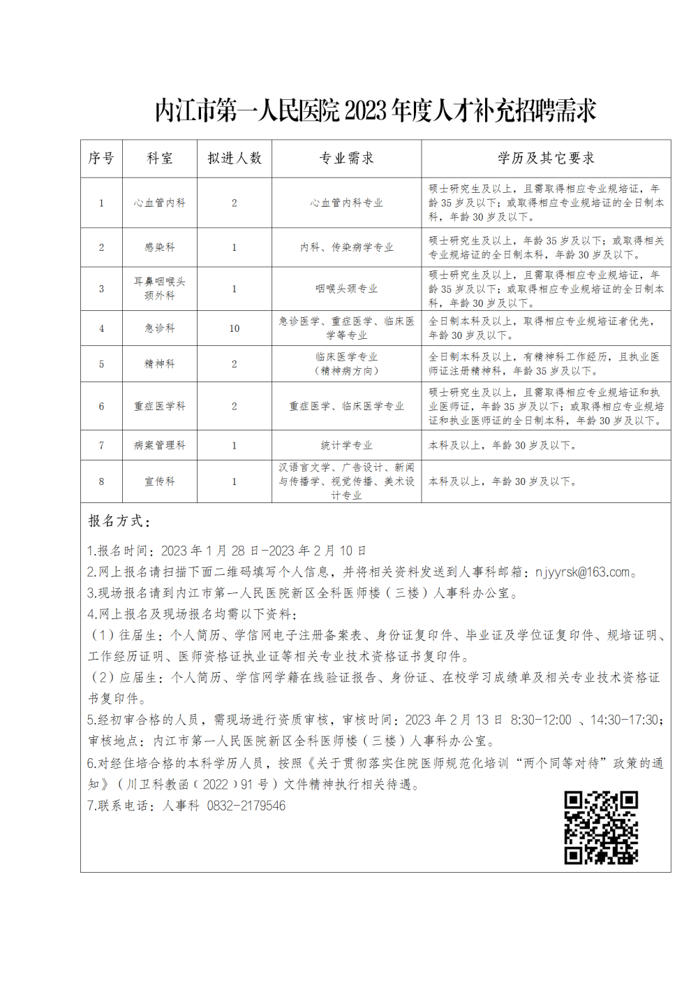 醫(yī)學教育網醫(yī)療衛(wèi)生招聘欄目每天都會更新全國各地新鮮招聘公告信息,致力于為廣大即將進入醫(yī)療衛(wèi)生系統(tǒng)/醫(yī)院/醫(yī)療事業(yè)單位的工作人員進行服務,以上就是醫(yī)學教育網小編為大家整理的:四川省內江市第一人民醫(yī)院2023年人才補充招聘20人,希望能夠幫助到大家。