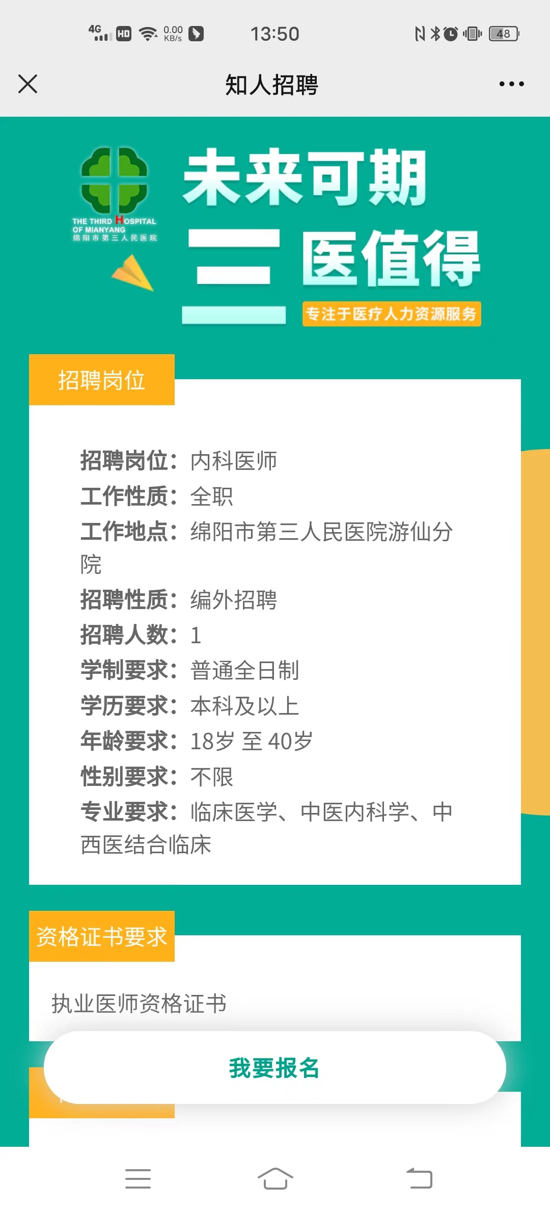 很多即將步入醫(yī)療崗位的朋友們都非常關(guān)注所在地區(qū)醫(yī)療崗位的招聘公告信息,醫(yī)學(xué)教育網(wǎng)醫(yī)療衛(wèi)生招聘欄目為了更好的服務(wù)正在找工作的醫(yī)療相關(guān)專(zhuān)業(yè)人員,每天為大家整理搜集新鮮的各地醫(yī)療衛(wèi)生系統(tǒng)/醫(yī)院等招聘公告通知和信息,歡迎大家查看!以下是公告通知:綿陽(yáng)市第三人民醫(yī)院游仙分院招聘內(nèi)科醫(yī)師1名,內(nèi)容如下: