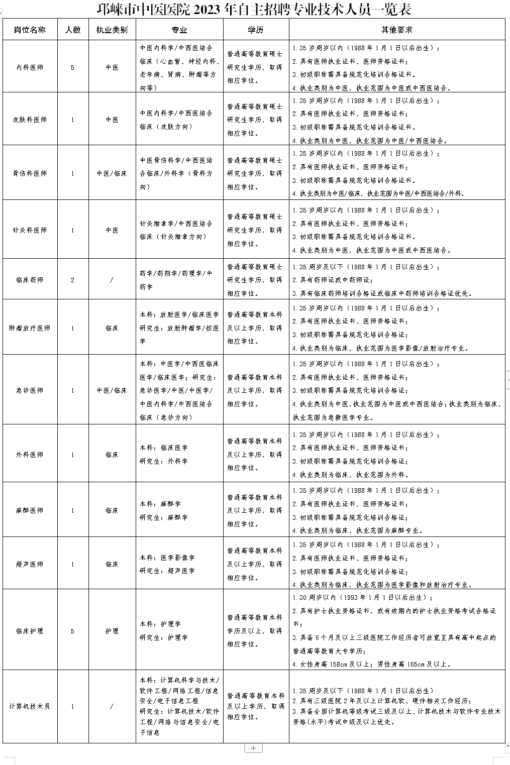 成都市邛崍市中醫(yī)醫(yī)院2023年自主招聘專業(yè)技術人員21名
