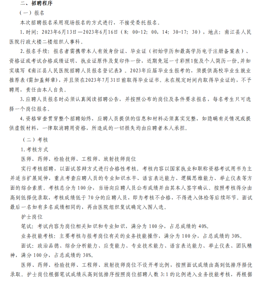 金錢名利淡如水,醫(yī)德醫(yī)道大于天;個(gè)人利益拋一旁,患者病情在心間。這是多少醫(yī)護(hù)崗位從業(yè)者的心聲,這又是多少醫(yī)療崗位從業(yè)者的真情實(shí)感。2023年醫(yī)療衛(wèi)生事業(yè)單位招聘公告陸續(xù)發(fā)布,以上就是四川省巴中市南江縣人民醫(yī)院2023年招聘工作人員30名的全部?jī)?nèi)容。