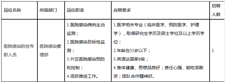 因工作需要,我院醫(yī)院感染管理部現(xiàn)面向社會公開招聘1名醫(yī)院感染防控專職人員: