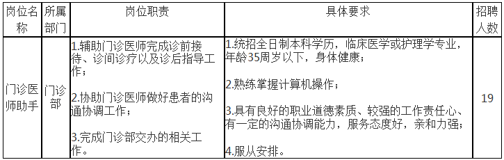 我院門診部現(xiàn)在面向社會(huì)公開招聘門診醫(yī)師助手19名: