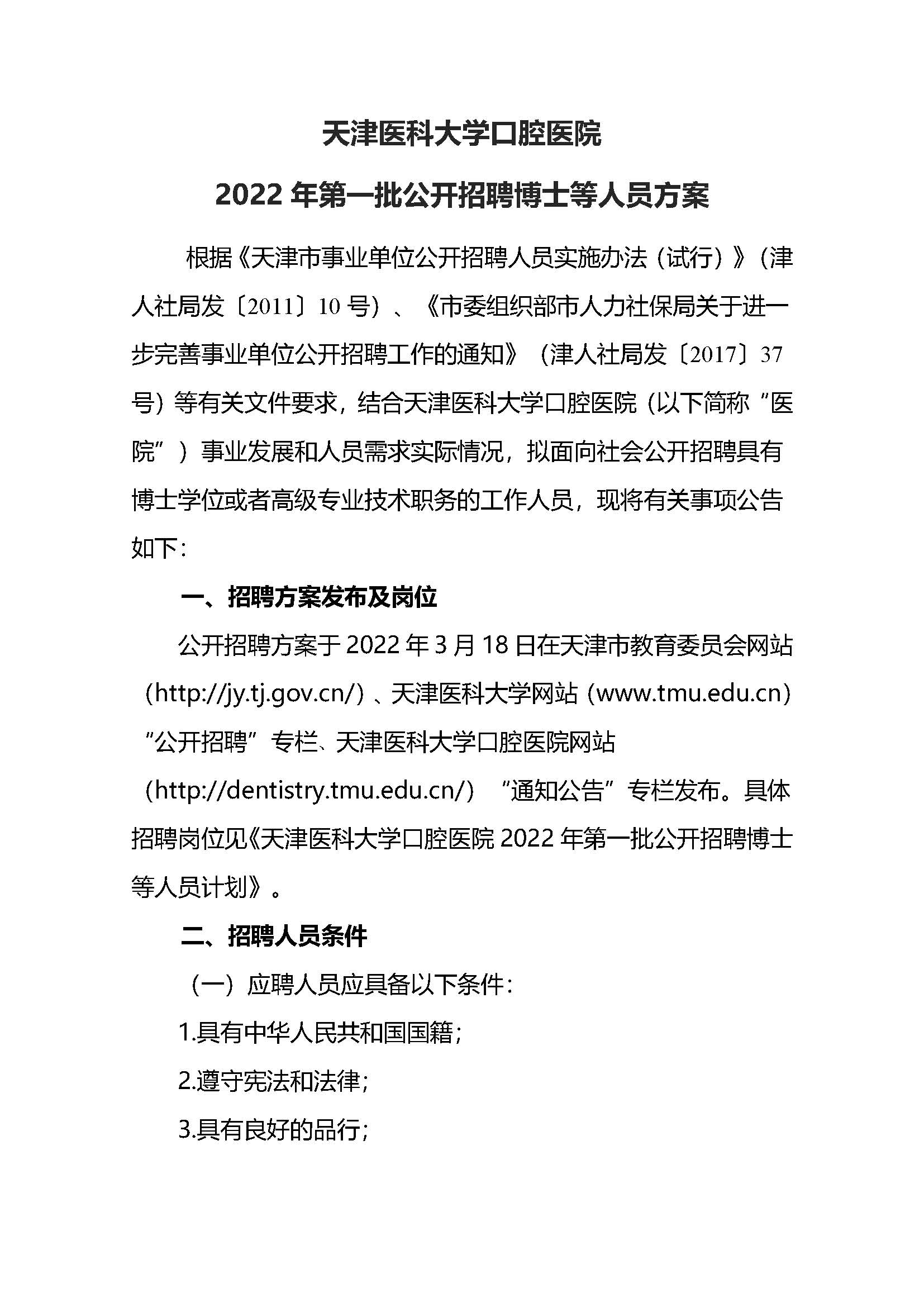 天津醫(yī)科大學(xué)口腔醫(yī)院2022年第一批公開招聘計劃 | ||||||||