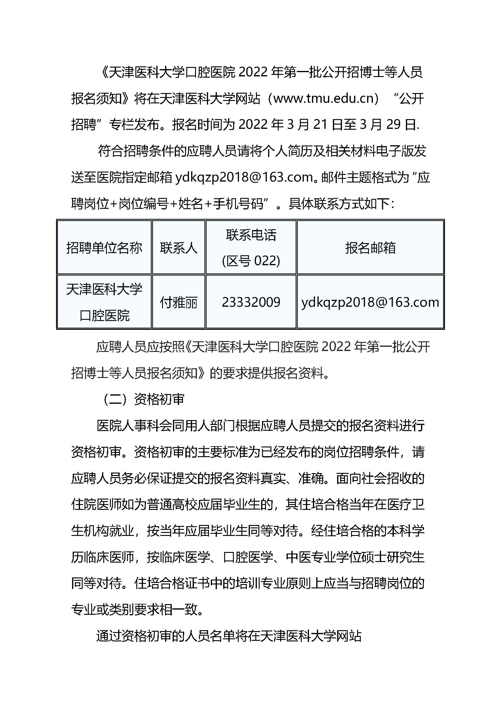 天津醫(yī)科大學(xué)口腔醫(yī)院2022年第一批公開招聘6人