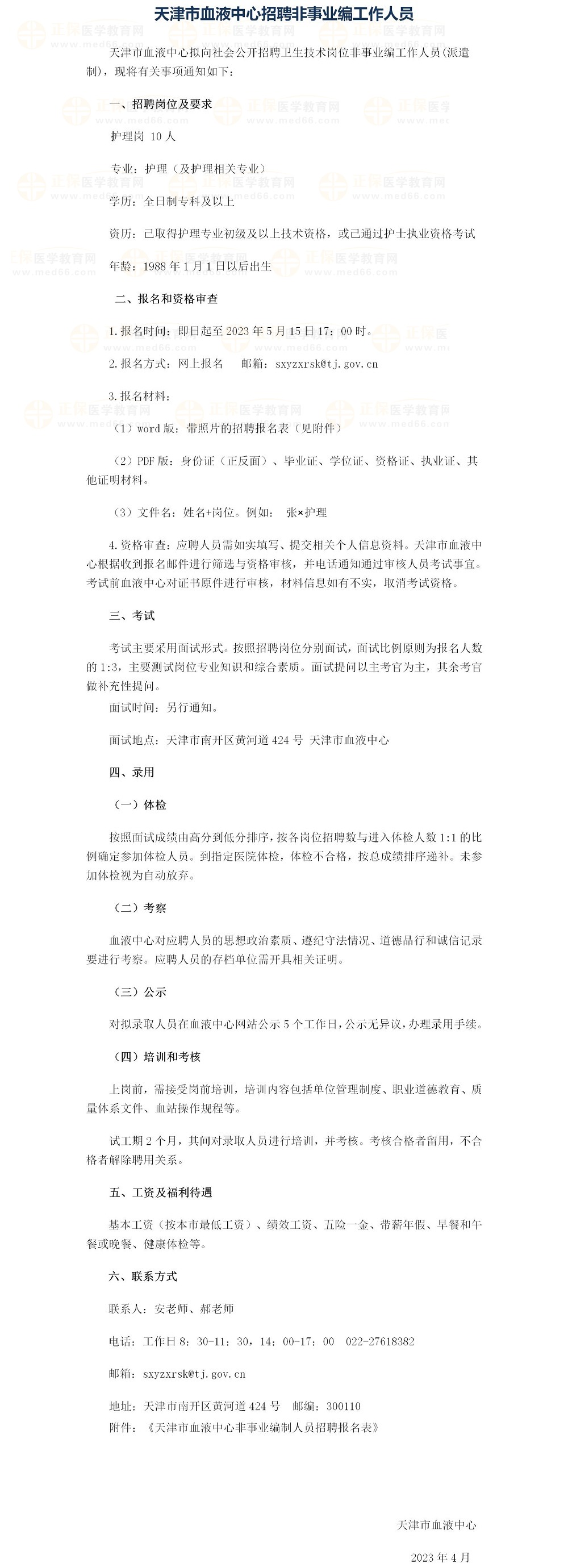 天津市血液中心2023年招聘護理崗10人