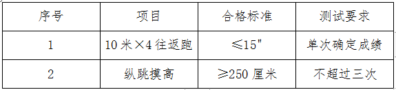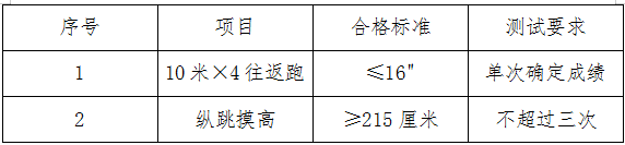 考核包括體能測試和面試兩部分,體能測試單項(xiàng)不合格或未按要求參加體能測試的人員,不能進(jìn)入面試。