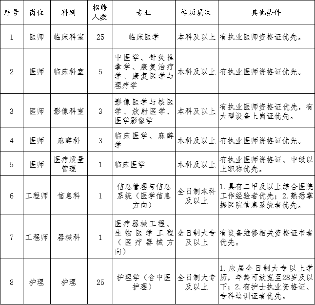 醫(yī)療人員,全日制本科及以上學(xué)歷,大專起點本科須具有執(zhí)業(yè)醫(yī)師資格證;護理人員,全日制大專及以上學(xué)歷。