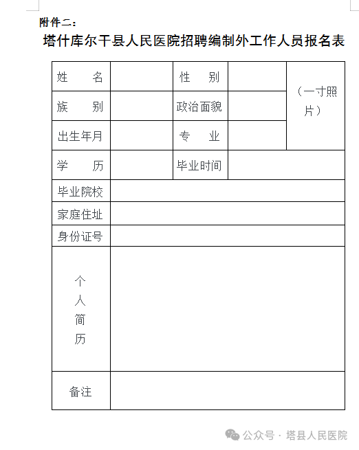 附件二:塔什庫爾干縣人民醫(yī)院招聘編制外工作人員人員報(bào)名表