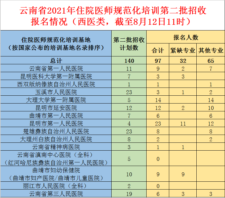 云南省2021年住院醫(yī)師規(guī)范化培訓(xùn)第二批招收?qǐng)?bào)名情況(西醫(yī)類(lèi),截至8月12日11時(shí))