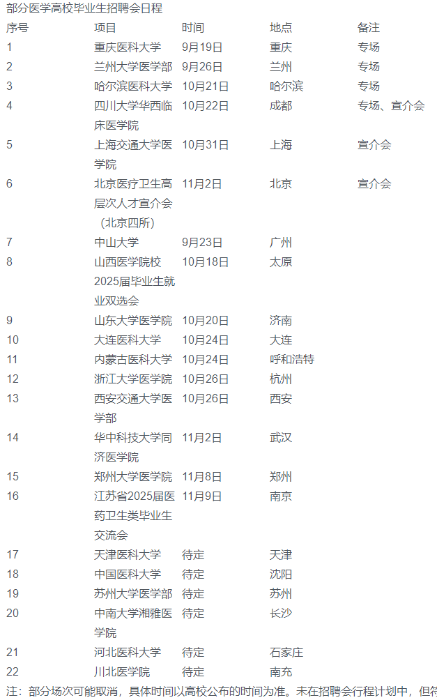 部分醫(yī)學高校畢業(yè)生招聘會日程
